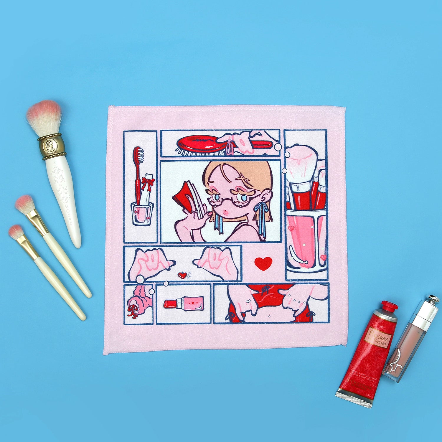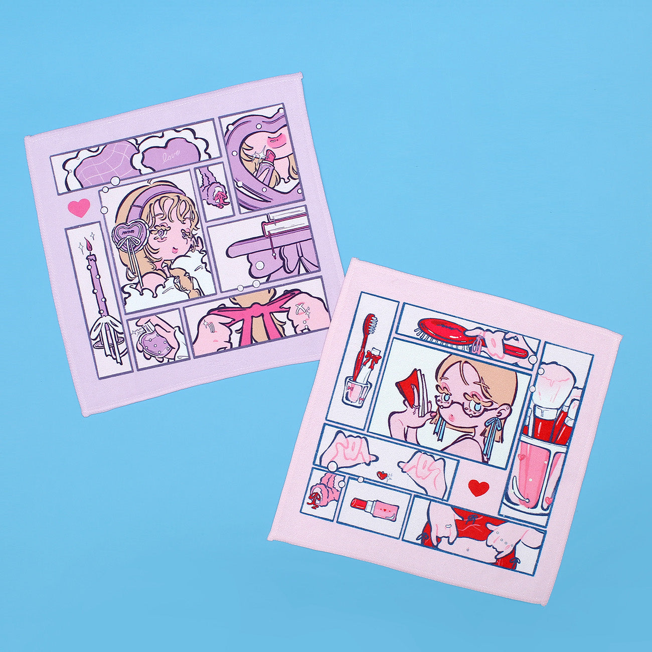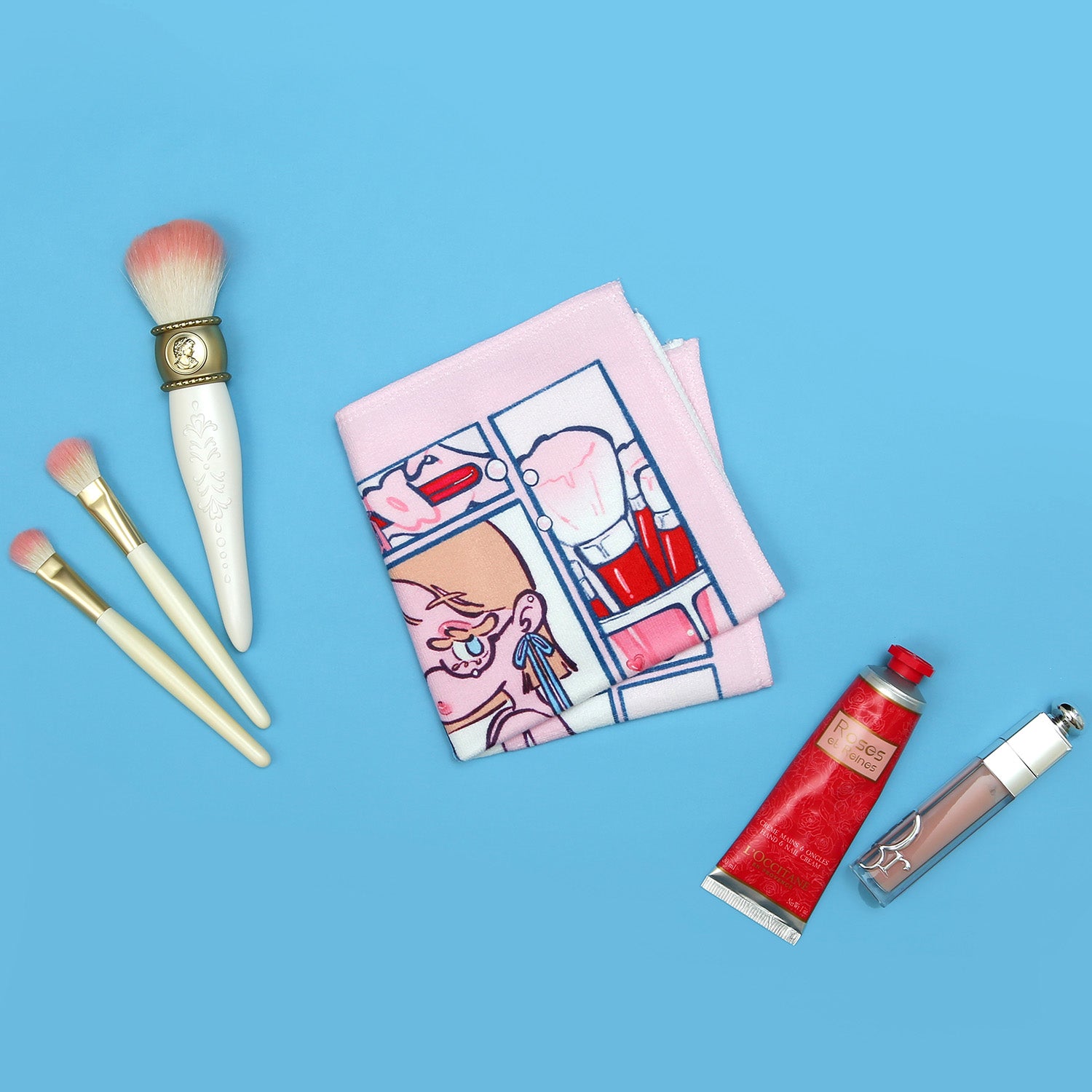 朝の時間を楽しむ女の子たちを描きました。持ち歩くだけで気分が上がるような、見るたびに「かわいい!」と心が躍るようなハンカチになれば嬉しいです。