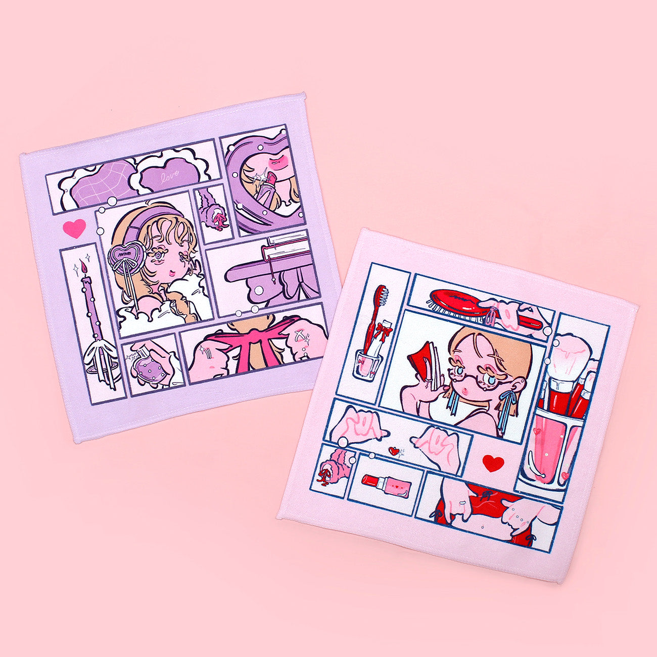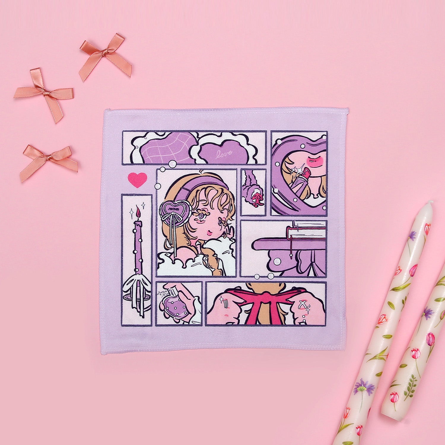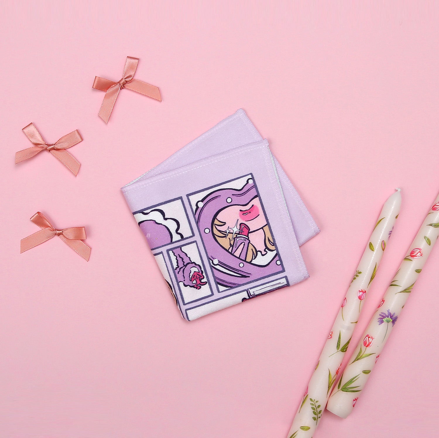 朝の時間を楽しむ女の子たちを描きました。持ち歩くだけで気分が上がるような、見るたびに「かわいい!」と心が躍るようなハンカチになれば嬉しいです。
