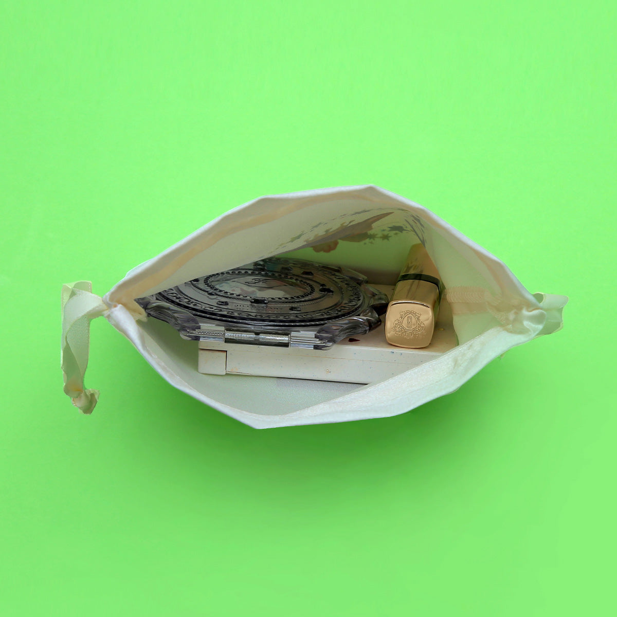 かわいいサテンがきらっと輝くきんちゃくポーチです。