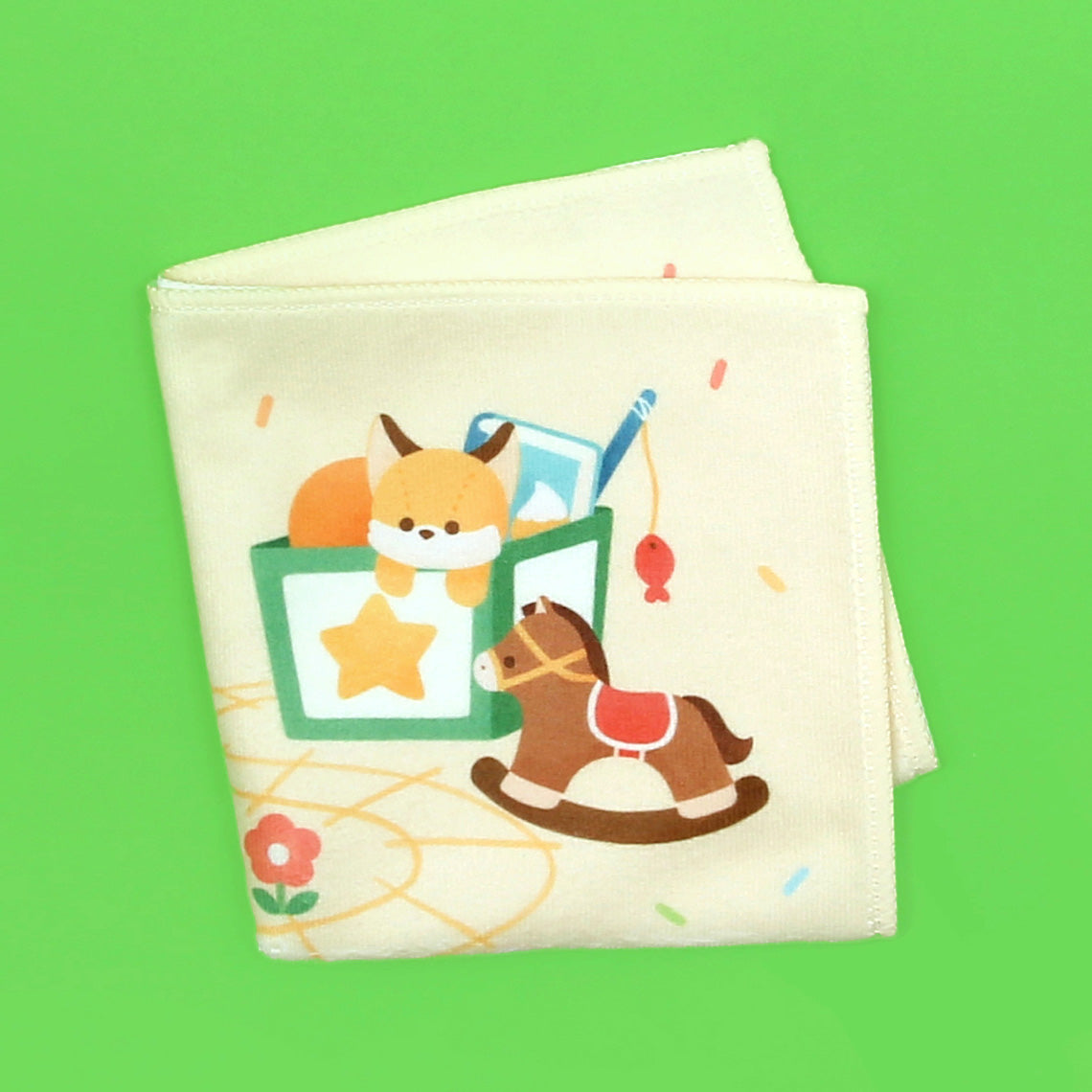 くまのケットとチャッピーが、楽しくあそぶ様子を描いたカラフルなハンドタオルです。